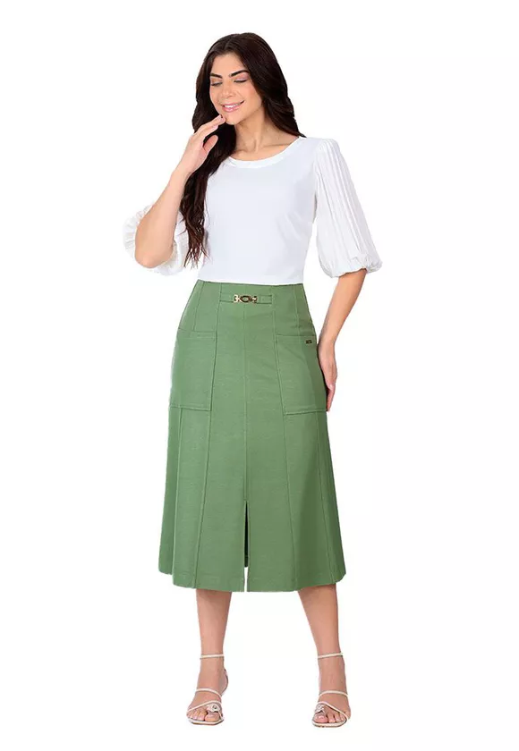 A saia Kayane foi confeccionada em malha ponto roma. O modelo apresenta detalhe em fivela fixa, fechamento traseiro por zíper invisível, bolsos funcionais, fenda frontal, shape em A levemente gode e possui forro. A saia Kayane é uma peça confortável e uma ótima escolha para compor looks elegantes.