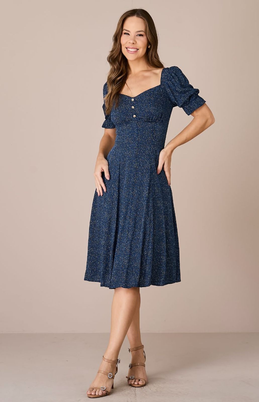 Suas mangas bufantes conferem um toque romântico e moderno, enquanto o decote em V valoriza o colo e proporciona um caimento perfeito. O fechamento frontal com botões adiciona um detalhe especial ao visual, permitindo que você ajuste o vestido de acordo com seu gosto.