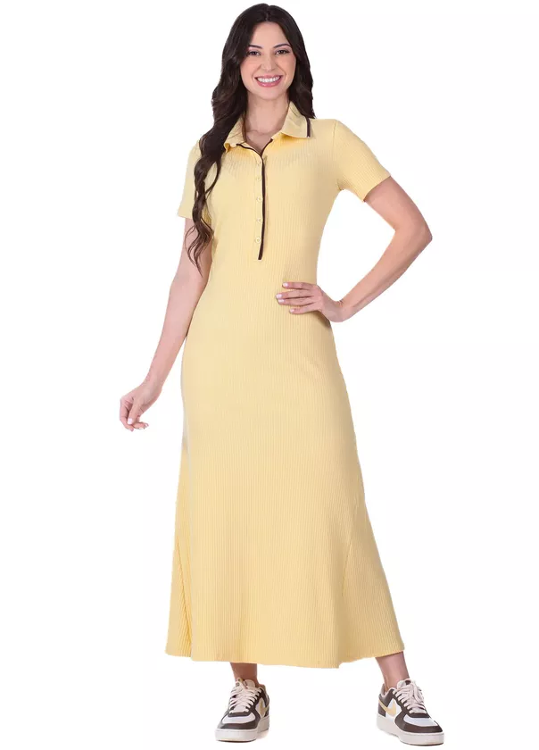 Feito em tecido canelado que se adapta ao corpo, garantindo liberdade de movimento e caimento natural. O vestido possui gola polo com botão, proporcionando acabamento refinado e toque casual. Ideal para quem quer uma peça prática que une conforto e modernidade.