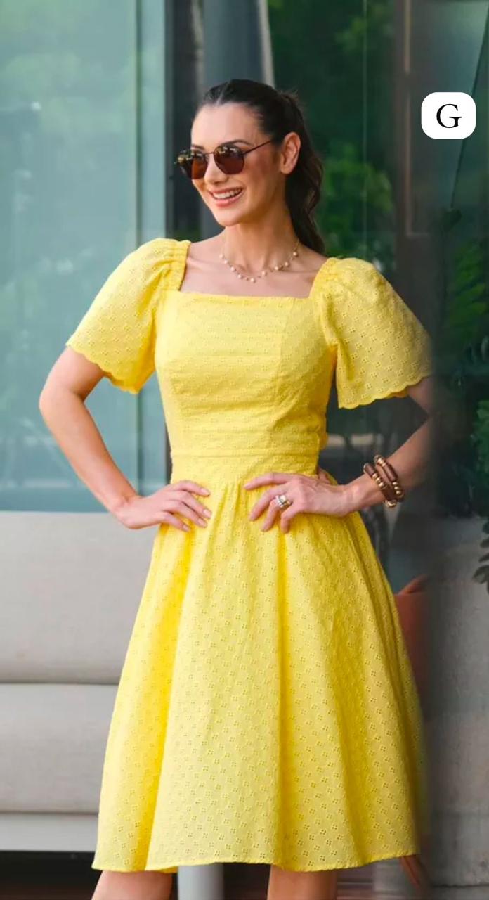 Apresentamos o Vestido Rita Tata Martello, uma peça que combina sofisticação e conforto. Feito com um tecido leve e de alta qualidade, este vestido amarelo apresenta um design encantador com mangas bufantes e um decote quadrado, ideal para realçar a silhueta feminina. A cor vibrante traz um toque de alegria e frescor, tornando-o perfeito para diversas ocasiões, desde festas ao ar livre até encontros casuais.