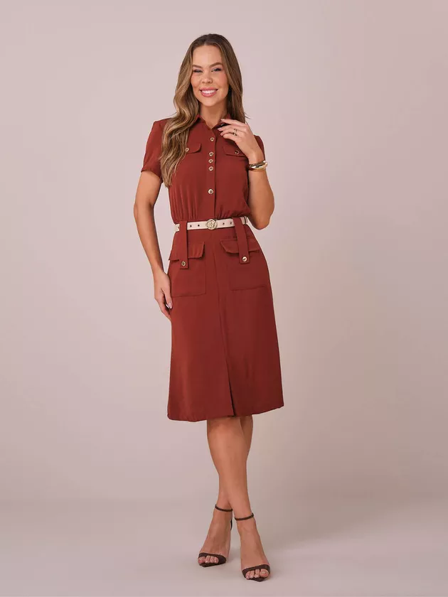 Vestido Roseane – TATA MARTELLO Elegância funcional para o dia a dia O Vestido Roseane é a escolha perfeita para quem busca sofisticação com praticidade. Com modelagem midi ajustada ao corpo, ele combina elementos clássicos e modernos em uma composição elegante e versátil. A gola estruturada, os detalhes em lapelas no busto com botões funcionais, os passantes modernos e os bolsos frontais garantem estilo e utilidade no uso diário. Acompanha cinto com fivela exclusiva que valoriza a cintura, enquanto o forro interno assegura conforto e caimento impecável. Ideal para produções refinadas com conforto e presença.