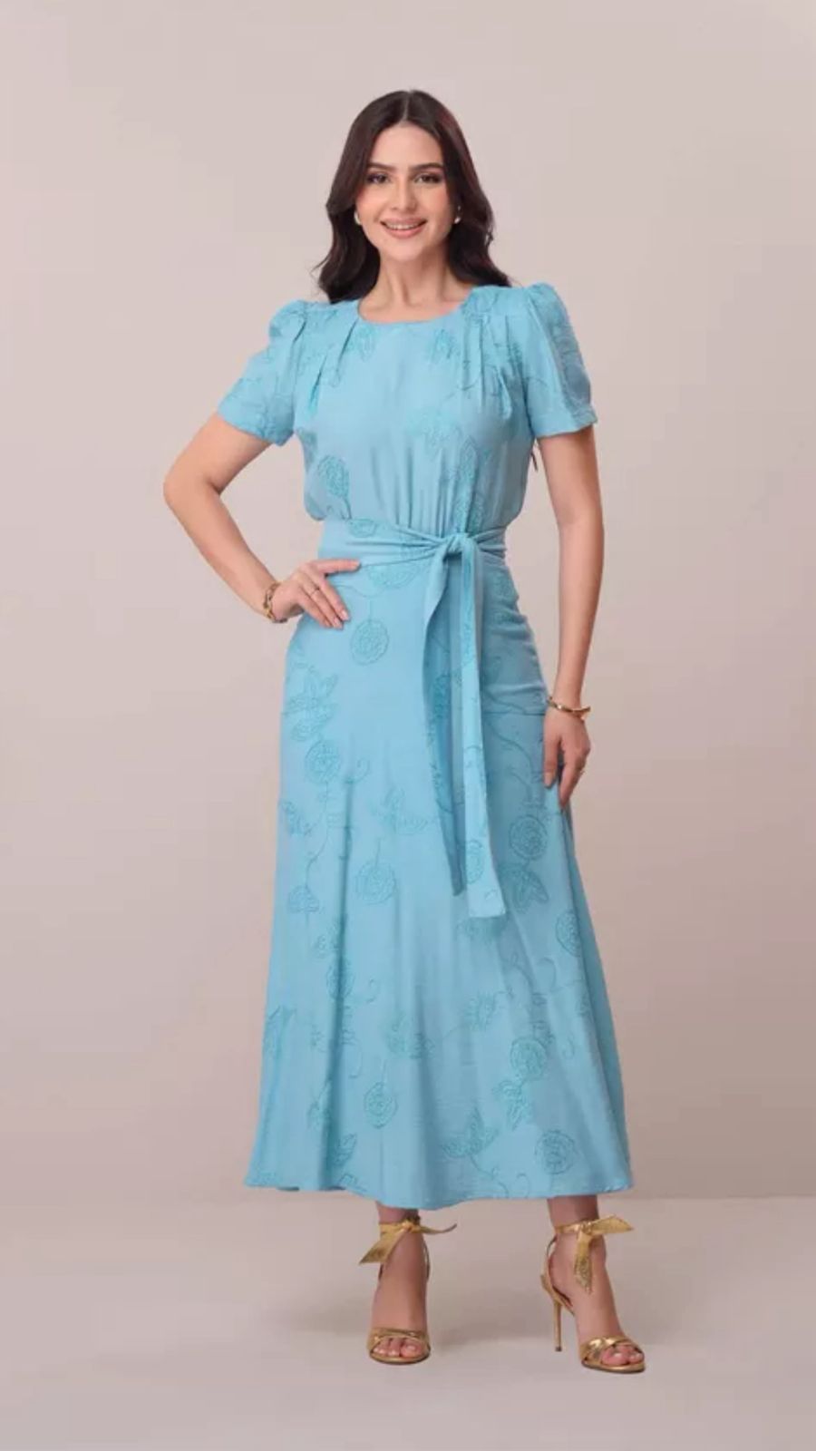 O Vestido Tereza da Tatá Martelo é uma escolha perfeita para quem busca elegância com conforto. Confeccionado em tecido leve com padronagem sutil, ele possui mangas bufantes que adicionam um toque delicado e cintura marcada com faixa para ajuste ideal ao corpo. O comprimento midi garante versatilidade para diversas ocasiões, desde eventos casuais até reuniões mais formais. Seu caimento fluido valoriza a silhueta de forma equilibrada e a cor azul confere frescor e sofisticação ao visual.